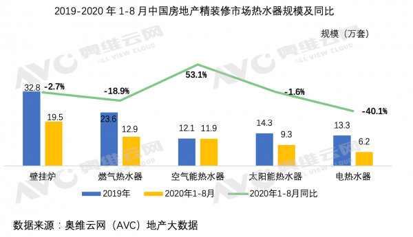 近日,根據(jù)奧維云網(wǎng)地產(chǎn)大數(shù)據(jù)顯示,2020年1-8月,商品住宅精裝市場開盤規(guī)模158.1萬套,同比下降25%,精裝市場空氣能熱水器逆勢增長,配套規(guī)模達(dá)11.9萬套,同比增長53.1%,是目前熱水器產(chǎn)品五大類型中唯一一個(gè)正增長的品類,其配套率也從去年同期的2.5%增至3.8%。