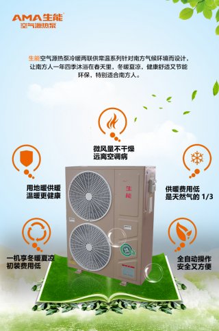 現在隨著生活水平提高,越來越多的人講究生活品質。生能冷暖兩聯供滿足南方人間歇式取暖需求,隨用隨開,節省能耗,升溫快,且以不高于60℃的熱水為介質不斷在管道中循環,通過地板輻射供暖的方式,自下而上均勻供暖,符合足暖頂涼的醫學原理,更健康。同時,生能冷暖兩聯供通過輸入1份電能,從空氣中吸收3份熱能,最后得到4份能量通過地暖散發到房間,因此它的供暖比燃氣供暖節省50%,比電供暖節省70%。此外生能采用R410環保冷媒,無毒無味無廢氣廢渣排放,無燃料泄漏、爆炸等隱患,更環保安全。