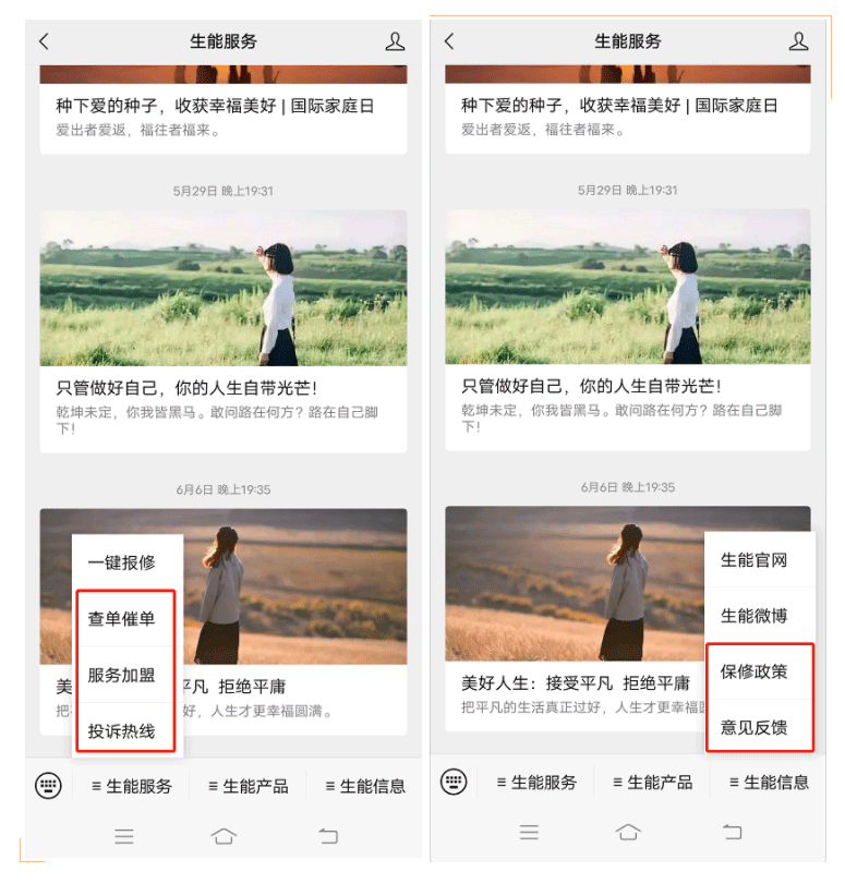 不管是生能空氣能經銷商還是用戶,關注“生能服務”,并在菜單欄上點擊相應選項,就可直接查看詳情。例如:點擊“生能信息”,選擇“保修政策”,“生能產品保修政策”就會自動跳出來,客戶可查看整個詳情,一目了然。