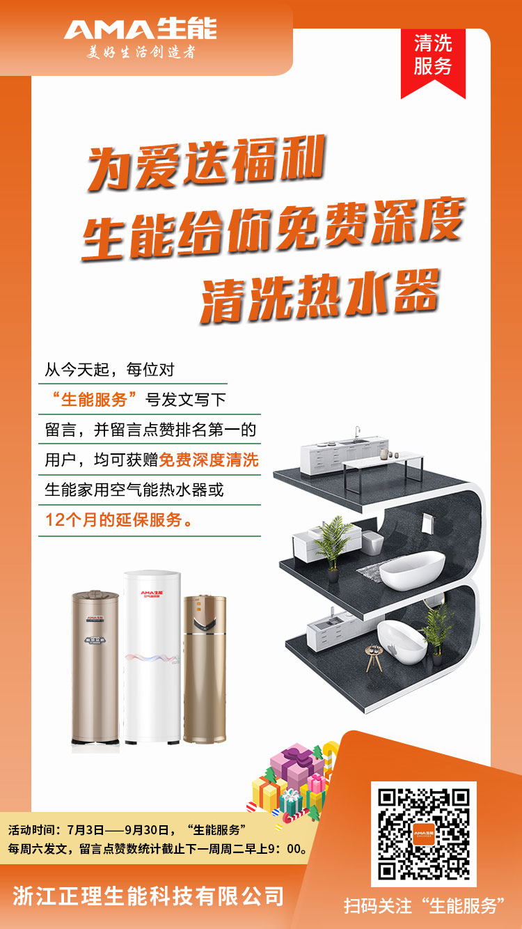 從心升級的生能空氣能服務,為愛送福利,為用戶免費深度清洗空氣能熱水器。從今天起,每位對“生能服務“號發文寫下留言,并留言點贊排名第一的用戶,均可獲贈免費深度清洗生能家用空氣能熱水器(根據需求免費更換鎂棒)或12個月的延保服務。
