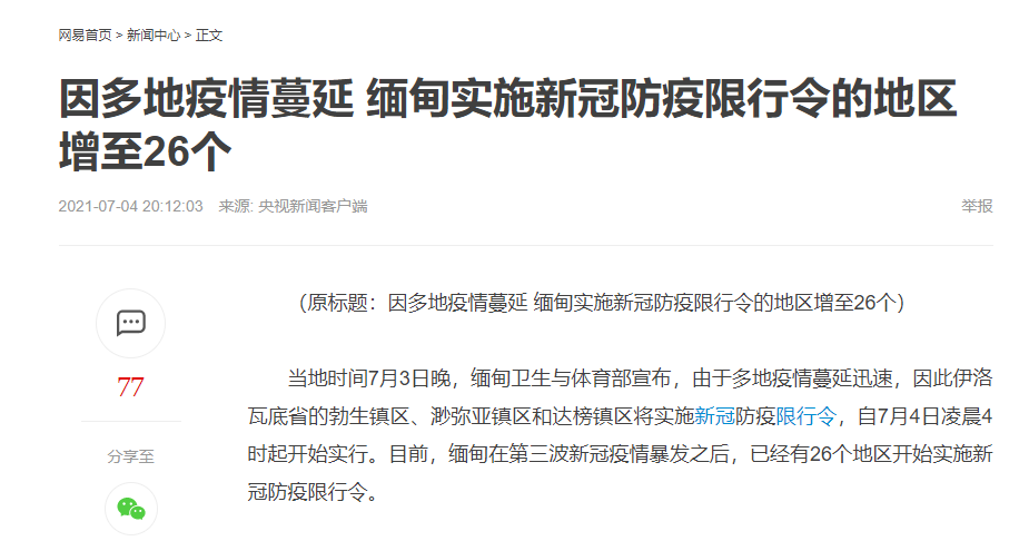近日,緬甸疫情開(kāi)始反彈,多地疫情蔓延,實(shí)施新冠防疫限行令的地區(qū)增至26個(gè)地區(qū)。與緬甸接壤的云南瑞麗疫情也拉響警報(bào),7月7日0時(shí)起,瑞麗主城區(qū)全員居家隔離,7月7日10時(shí)起,瑞麗姐告國(guó)門(mén)社區(qū)調(diào)整為高風(fēng)險(xiǎn)地區(qū)。