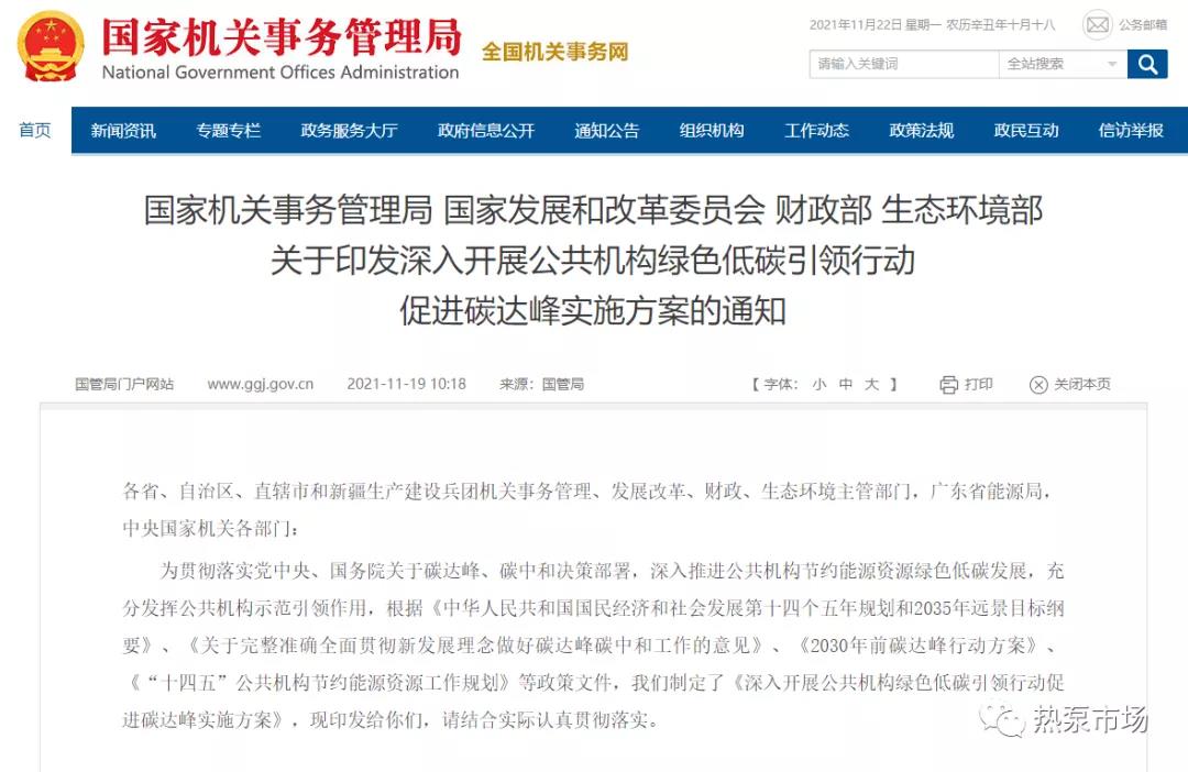 11月19日,國家機關事務管理局、國家發展和改革委員會、財政部、生態環境部4部門聯合下發《關于印發深入開展公共機構綠色低碳引領行動促進碳達峰實施方案的通知》。通知提出,鼓勵因地制宜采用空氣能、水源、地源熱泵等清潔用能設備替代燃煤、燃油、燃氣鍋爐。因地制宜推廣利用地熱能、生物質能等能源和熱泵技術,滿足建筑采暖和生活熱水需求,到2025年實現新增熱泵供熱(制冷)面積達1000萬平方米。