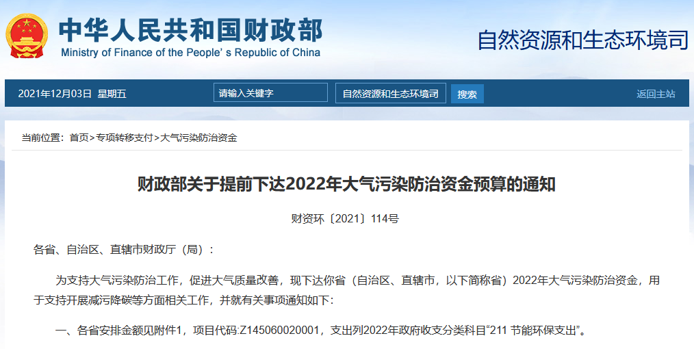 11月17日,財政部《關于提前下達2022年大氣污染防治資金預算的通知》指出,為支持大氣污染防治工作,促進大氣質量改善,下達各省(自治區、直轄市)2022年大氣污染防治資金,總計207億元,用于支持開展減污降碳等方面相關工作,主要包括支持北方地區冬季清潔取暖、工業污染深度治理等重點工作。