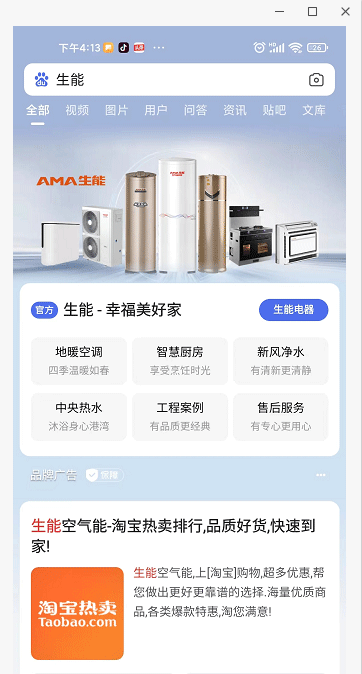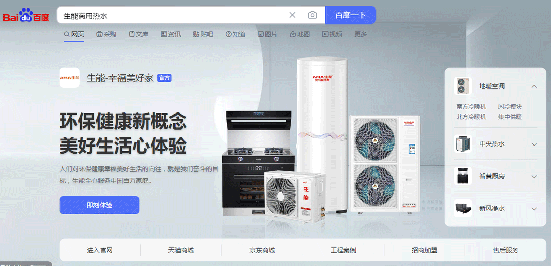 不管是手機上還是電腦端, 你在百度搜索輸入“生能” 首先映入眼簾的是 霸屏在最上方的生能 (生能—幸福美好家 官方)。 “環保健康新概念 美好生活心體驗” 幾個大字和生能空氣能系列戶式產品 更是引人注目。 生能百度品牌專區電腦端 以上就是生能空氣能百度品牌專區。為便于客戶隨時隨地迅速找到準確醒目的生能,讓客戶便捷放心選擇,生能入駐百度品牌專區。 生能空氣能的百度品牌專區還承載著“企業新聞、產品、售后服務、天貓旗艦店、京東旗艦店”等多個維度的信息要點及跳轉鏈接。 生能百度品牌專區手機端 客戶根據自己的需求,可一鍵點擊生能百度品牌專區上的生能官網、售后服務、工程案例、天貓商城,或直接點擊選擇地暖空調、智慧廚房、中央熱水、新風凈水等生能產品品類,立馬進入相應頻道,獲取相關生能可靠信息資料,體驗便捷服務,讓客戶輕松了解生能空氣能實況,直觀感受品牌魅力。 這為客戶與生能空氣能搭建銜接的“網絡橋梁”,也為提升生能空氣能品牌影響力搭建了重要陣地。 在百度上除了輸入生能空氣能跳出生能百度品牌專區外,輸入生能空氣能熱水器、生能地暖空調、生能冷暖兩聯供、生能商業熱水等等與生能相關的關鍵詞、模糊詞,都能直接進入生能百度品牌專區,讓客戶在眾多鏈接中一眼就找到生能官方網址,避免被非官網誤導。 百度品牌專區的申請有一套嚴格的審核規則。生能經過了信用記錄、業績表現、經營實力、品牌資質等復雜流程的全面評估。生能霸屏百度品牌專區是實力的展現,也給客戶便捷服務和可靠保障帶來升級! 生能持續精進,在為客戶提供優質品質和服務的基礎上,升級品牌影響力,向客戶全方面展示生能,圍繞客戶體驗進行多方面升級。 生能入駐百度品牌專區,占據國內主流搜索引擎入口制高點,是繼央視四次報道生能、生能高鐵深度戰略合作之后又一次品牌影響力升級大動作。 生能空氣能的使命是人們對環保健康幸福美好生活的向往就是我們奮斗的目標。圍繞這一使命,生能從各個方面發力,全心全意服務好客戶,生能百度品牌專區也是其中動作之一。想要具體感受的朋友,拿出你的手機或在電腦上,打開百度搜索“生能”吧。 生能也將再接再厲進一步增強品牌影響力,并持續創造超越客戶設想的價值。