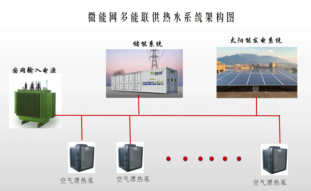 微能網(wǎng)熱水系統(tǒng)由外供能源系統(tǒng)、儲(chǔ)能系統(tǒng)、太陽能發(fā)電系統(tǒng)、空氣能熱水器水系統(tǒng)、恒溫恒壓供熱系統(tǒng)、自動(dòng)化控制系統(tǒng)等組成。