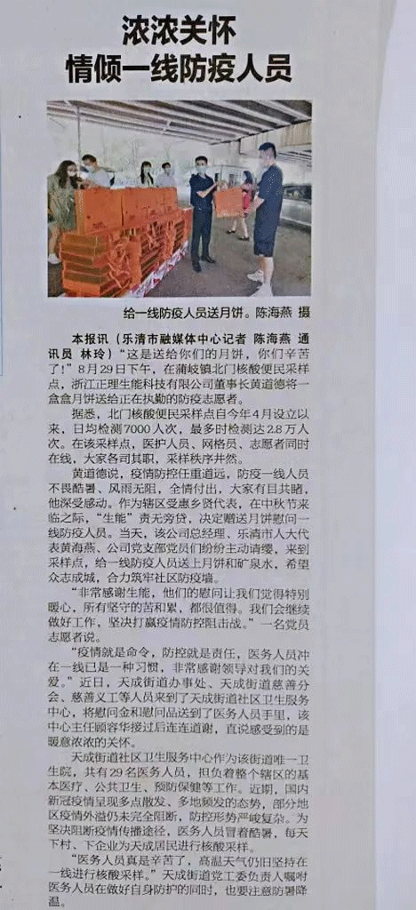 9月1日,在樂清土生土長的生能空氣能又登上了本地官方媒體《樂清日報》。此次生能空氣能又做了什么呢?詳情見《樂清日報》第8版《濃濃關懷 情頃一線防疫人員》。
