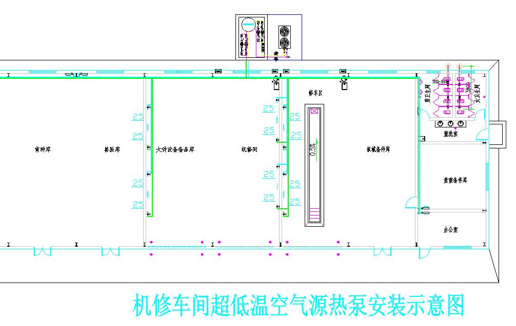 機(jī)修車間:機(jī)修車間為磚混結(jié)構(gòu),大件設(shè)備備品庫(kù)、機(jī)修間及修車區(qū),其供暖面積為285㎡,另外其他庫(kù)房、衛(wèi)生間及辦公室供暖面積580㎡。生能為其配置了1臺(tái)DLRK-80II生能超低溫空氣源熱泵冷暖機(jī)組,保障其冬季供暖室內(nèi)溫度可達(dá)0-10℃左右。