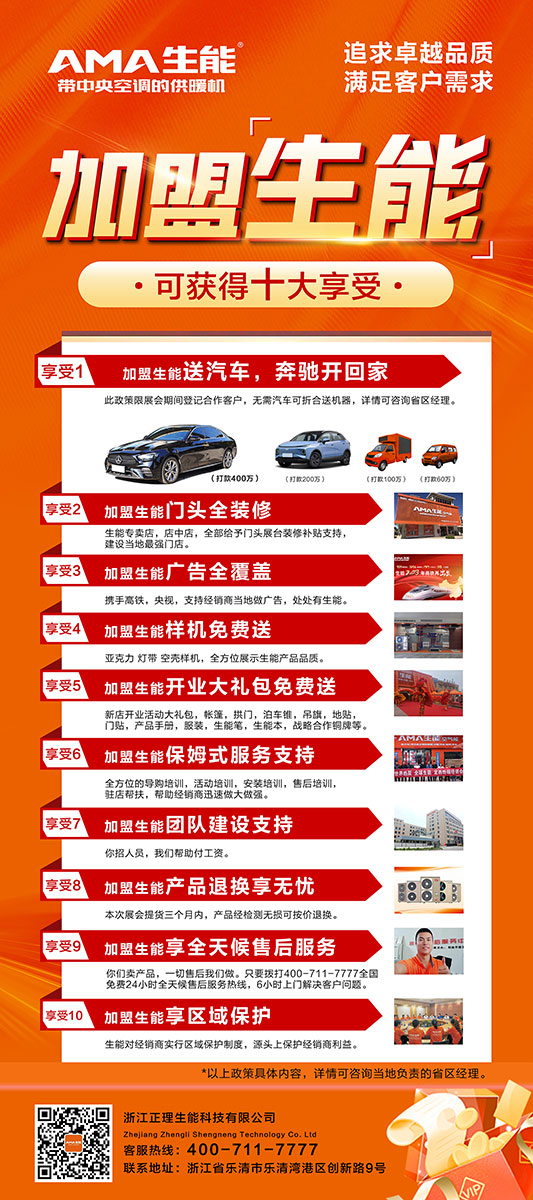 加盟生能送汽車啦,還可享受門頭全裝修、廣告全覆蓋、樣機免費送、保姆式服務支持、團隊建設支持等多重福利,機不可失,快來加入吧。詳情可咨詢當地負責的省區經理,或撥打生能全國服務熱線400-711-7777。