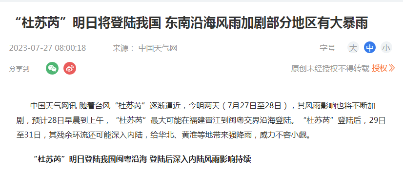 中國天氣網(wǎng)訊 隨著臺風(fēng)“杜蘇芮”逐漸逼近,今明兩天(7月27日至28日),其風(fēng)雨影響也將不斷加劇,預(yù)計28日早晨到上午,“杜蘇芮”最大可能在福建晉江到閩粵交界沿海登陸。“杜蘇芮”登陸后,29日至31日,其殘余環(huán)流還可能深入內(nèi)陸,給華北、黃淮等地帶來強(qiáng)降雨,威力不容小覷。