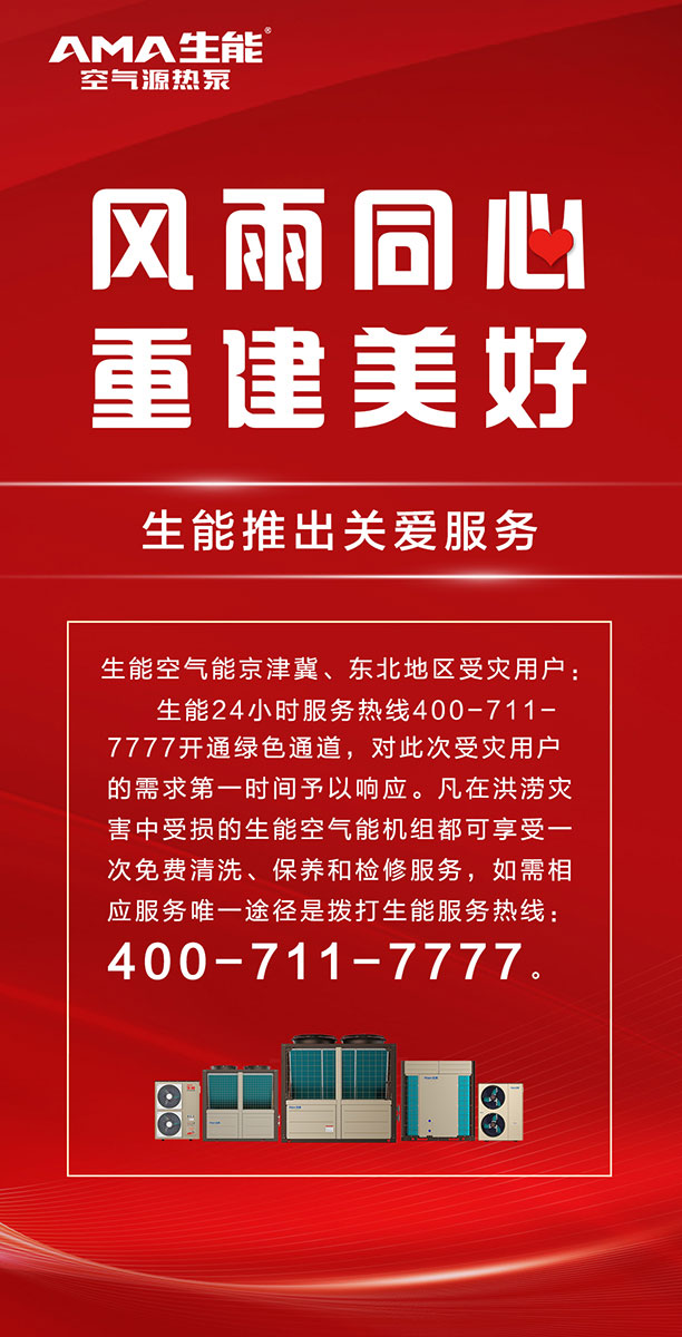 8月12日,針對生能空氣能京津翼、東北地區受災用戶,生能推出關愛服務:凡在洪澇災害中受損的生能空氣能機組都可享受一次免費清洗、保養和檢修服務。