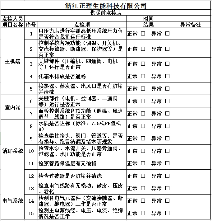 《供暖前點(diǎn)檢表》中的15條點(diǎn)檢項(xiàng),