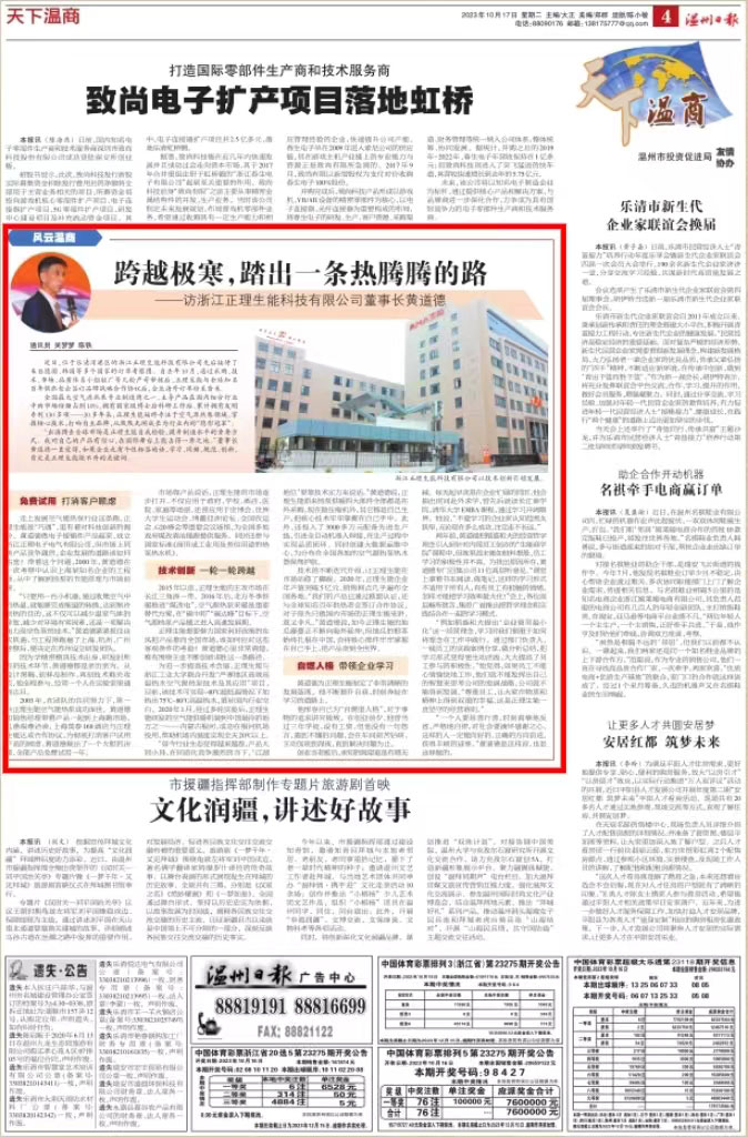 10月17日,《溫州日?qǐng)?bào)》天下溫商版《跨越極寒,踏出一條熱騰騰的路——訪浙江正理生能科技有限公司董事長(zhǎng)黃道德》大篇幅報(bào)道生能空氣能董事長(zhǎng)黃道德創(chuàng)業(yè)史及其企業(yè)發(fā)展歷程。