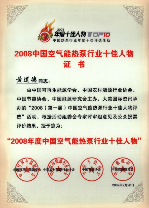 2009年2月20號,濟南舜耕會館,由中國節能協會舉辦,大美國際咨訊協辦的首屆中國熱泵行業年度人物獎頒獎典禮在濟南拉開序幕,我公司董事長黃道德同志因對中國空氣源熱泵產品的開發和推廣作出重大貢獻,被評為2008年熱泵行業十佳人物。