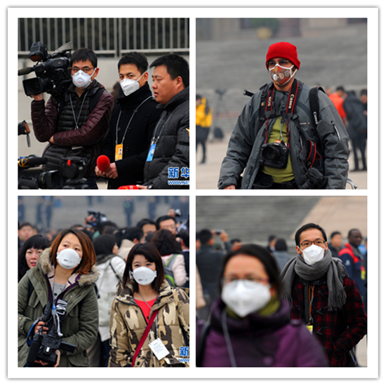 全國政協第十二屆二次會議開幕會當日,北京再度迎來一個霧霾天,大會堂大會堂東門外廣場,上演了一場口罩Style。 ——轉自新華網