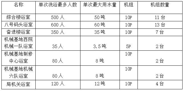 生能項目負責人時經理表示,該工程類型是浴室熱水改造項目。根據大港公司提供的信息,項目分為幾個浴室并且每天的洗浴時間固定,每人每天按照100L計算,機組與水箱均放置在用戶指定位置,本方案根據本工程的特點設計熱水制取系統安裝和回水管路部分,將熱水制取系統與貴方預留好的冷水端口、供熱水端口駁接即可;大港公司要求熱水加熱時間間隔為8h,根據貴方的相關技術要求,我方進行了如下配置: