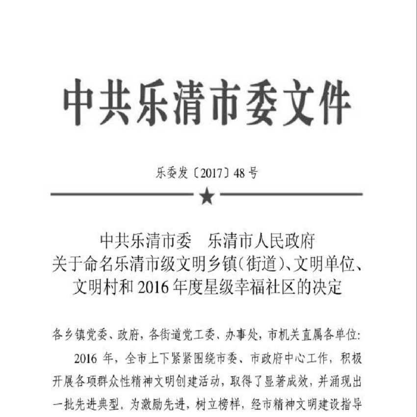近日,中共樂清市委、樂清市人民政府發(fā)布了《關(guān)于表彰2016年市級(jí)文明鄉(xiāng)鎮(zhèn)(街道)、文明單位、文明村和星級(jí)幸福社區(qū)的決定》(樂委發(fā)[2017]48號(hào)),浙江正理生能科技有限公司榮獲“2016年市級(jí)文明單位”稱號(hào)。