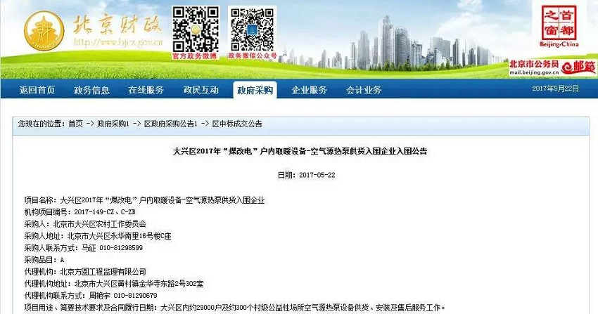 項目名稱:大興區2017年“煤改電”戶內取暖設備-空氣源熱泵供貨入圍企業