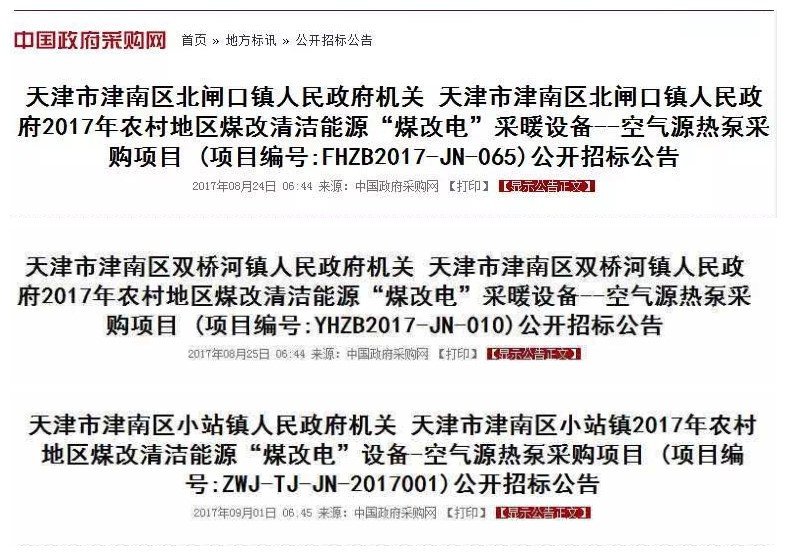 天津市津南區(qū)小站鎮(zhèn)2017農(nóng)村地區(qū)煤改清潔能源“煤改電”設備——空氣源熱泵采購項目公開招標,項目預算4433.5萬元;