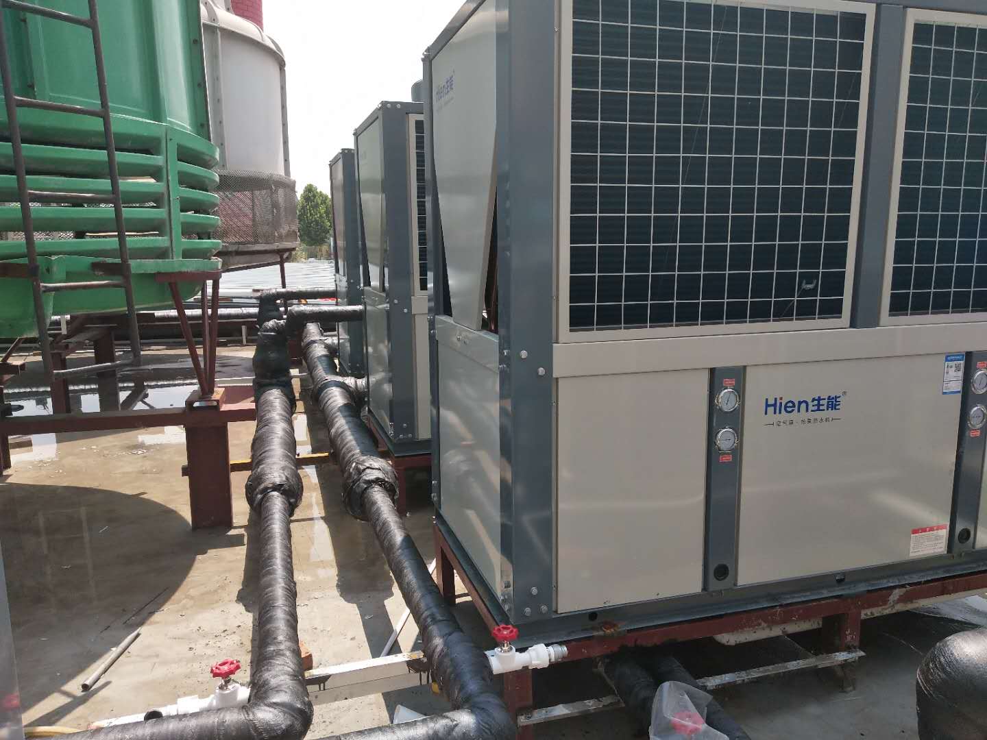 據項目負責人黨經理介紹,根據熱泵機組應用場所劃分,生能為該項目配置了4臺50p中央熱水機組及5臺30p、2臺10p、5臺3.6p的泳池恒溫機組,分別提供180噸、50度洗浴熱水和保障1500噸的泳池恒溫,在有效提高樂園水上娛樂體驗的舒適性和靈活性的同時,全面保障了游客戲水后健康、優質的熱水洗浴需求。