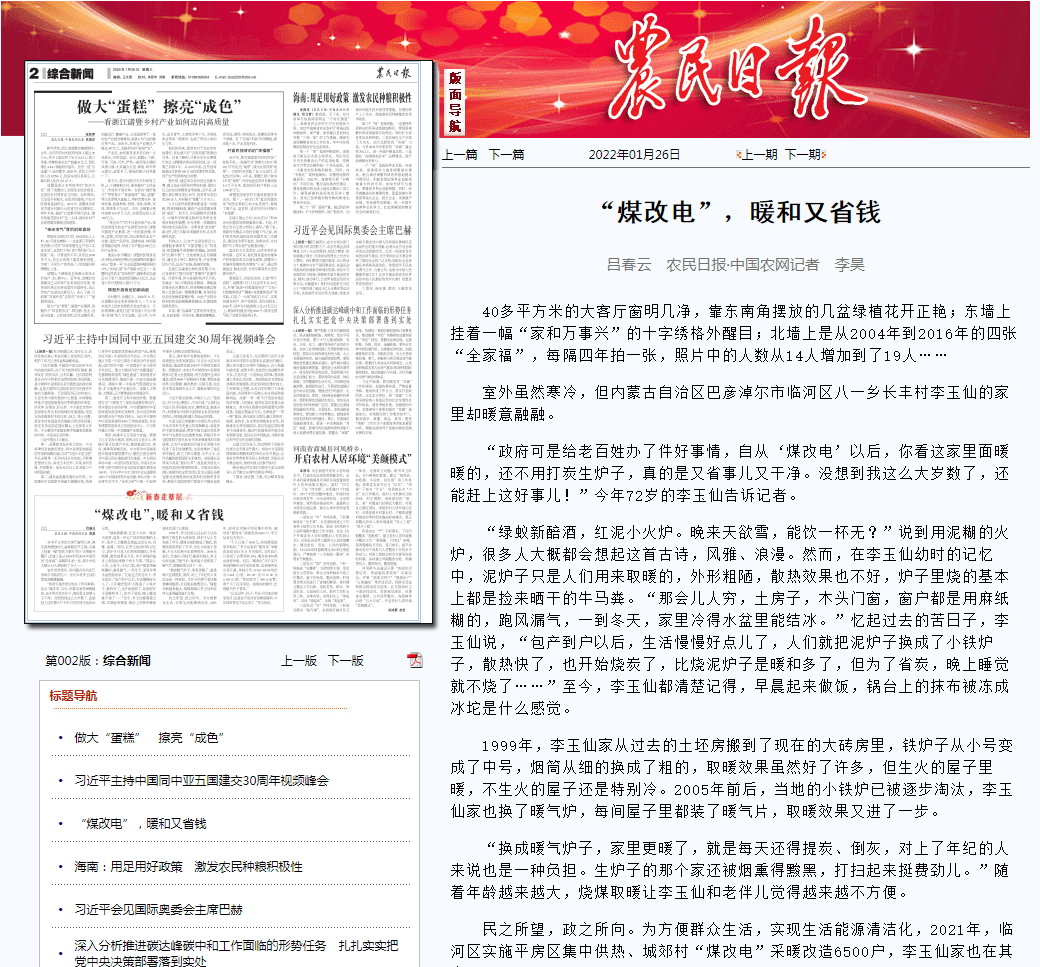 煤改電政策下,改變了臨河區百姓傳統取暖方式,選用生能空氣能供暖的臨河區八一鄉長豐村的李玉仙表示:“政府可是給老百姓辦了件好事情,自從“煤改電”以后,這家里暖暖的,還不用打炭生爐子,真的是又省事兒又干凈。我們家交了500元電費,兩個月了還沒用完。按現在的煤價,比燒暖氣爐子省錢?!边@些話是李玉仙跟《農民日報·中國農網》記者所說的,并刊登在《農民日報》的文章《“煤改電”,暖和又省錢》中。詳情如下: