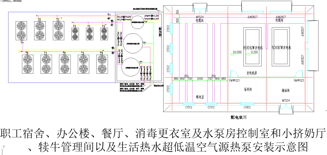 職工宿舍、辦公樓及餐廳及餐廳、消毒更衣室及水泵房控制室:各辦公樓及餐廳1268㎡,職工宿舍4788㎡,消毒更衣室423㎡,水泵房控制室120㎡。生能為其相應(yīng)配置了6臺(tái)DLRK-160II生能超低溫空氣源熱泵冷暖機(jī)組,保障其冬季供暖室內(nèi)溫度可達(dá)18-22℃左右。
