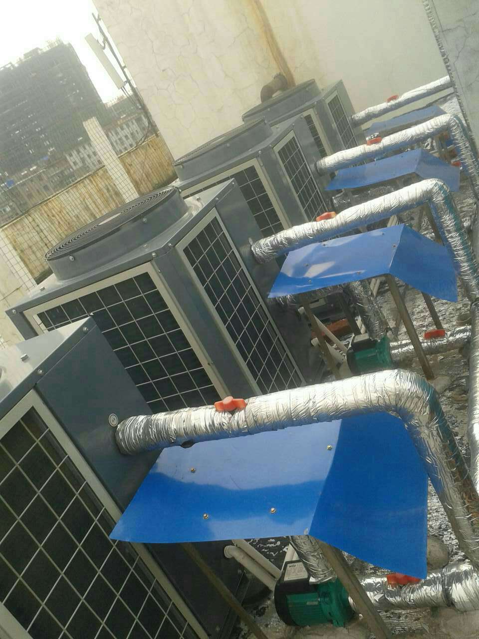 設備選型:配置生能泳池機KFXRS-90II(30P)型號機組3臺,高溫機GKFXRS-27II(10P)型號機組20臺