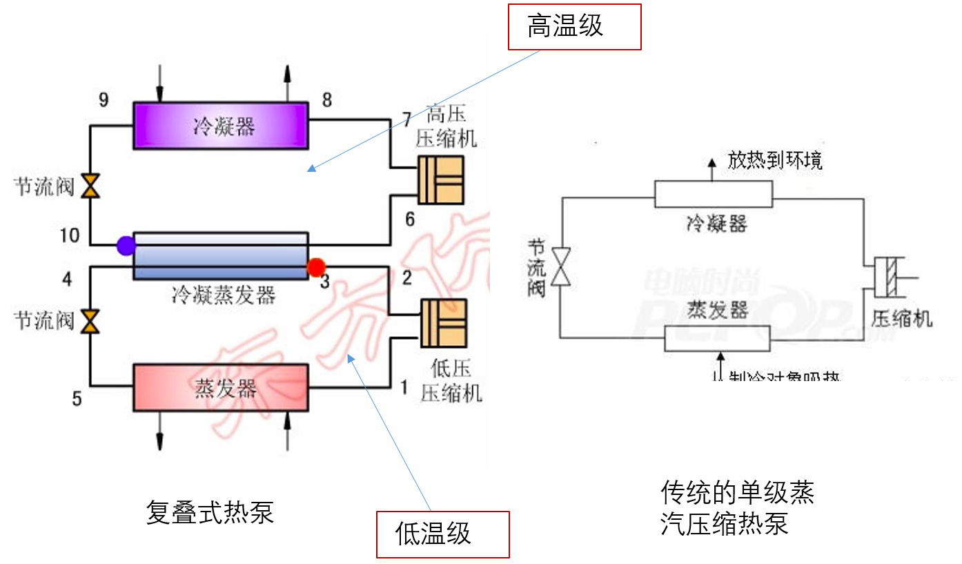 復疊式蒸氣壓縮熱泵循環是由兩個或兩個以上的單級(也可以是多級)熱泵循環組成,在兩個熱泵系統中充加不同性質的制冷劑,既能滿足在較低蒸發溫度時有合適的蒸發壓力,又能滿足在高水溫度條件下冷凝時具有適中的冷凝壓力。
